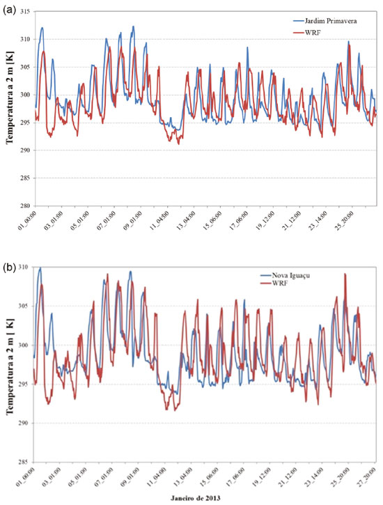 ![]() Figura 3. (a) Comparação entre as temperaturas observadas na Estação meteorológica de Jardim Primavera e simuladas pelo WRF para o local, (b) Comparação entre as temperaturas observadas na estação meteorológica de Nova Iguaçu e simuladas pelo WRF para o local
