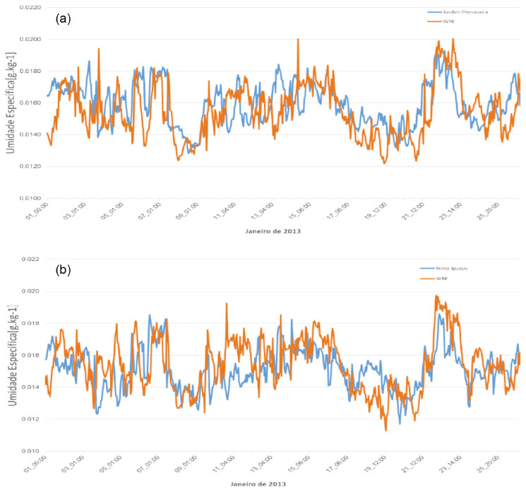 ![]() Figura 4. (a) Comparação entre a umidade específica observadas na estação meteorológica de Jardim Primavera e simuladas pelo WRF para o local, (b) Comparação entre a umidade específica observadas na estação meteorológica de Nova Iguaçu e simuladas pelo WRF para o local