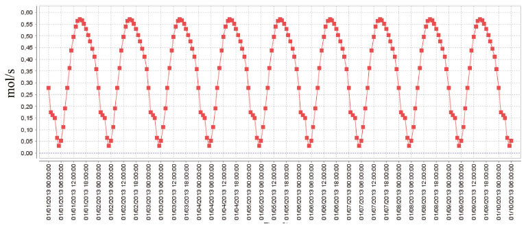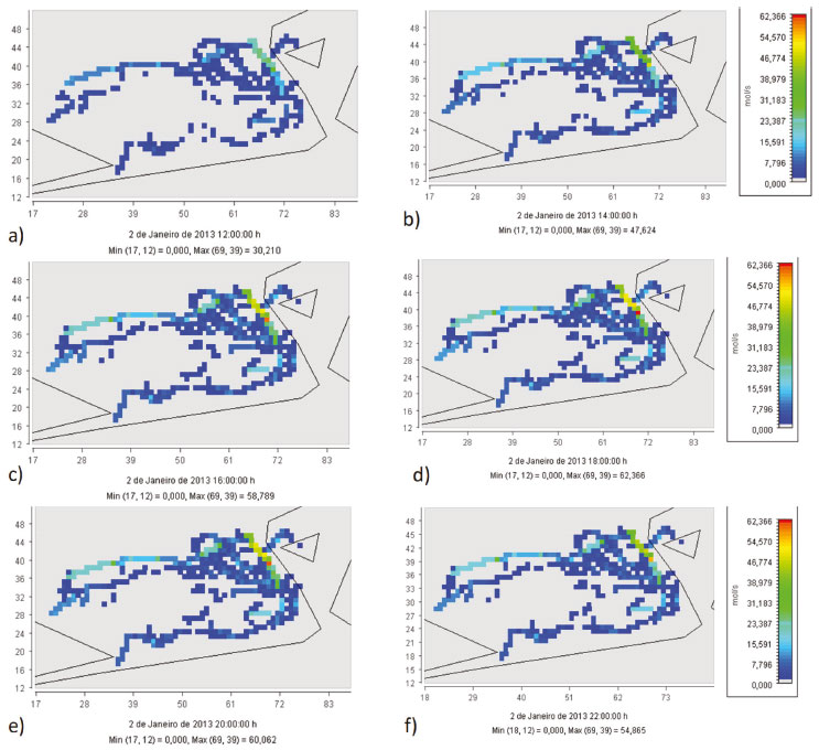 Como é possível observar, o horário de maior pico ocorreu às 18 horas (Figura 5d), na localização da célula 69x39, posicionada no entroncamento entre a Linha Vermelha e a Avenida Brasil, próximo ao bairro do Caju, Rio de Janeiro. Foi observado o valor máximo de emissão de 62,366 mol s-1 para o CO. A análise das figuras mostra que, ao longo de todo o dia, o entroncamento entre a Linha Vermelha e a Avenida Brasil apresenta as maiores concentrações de CO em relação as outras regiões inventariadas. A Figura 6 apresenta o perfil da distribuição média horária das emissões de CO entre os dias 1 e 10 de janeiro de 2013, emitido por fontes veiculares. O gráfico foi construído considerando todas as fontes inventariadas no presente estudo. Os valores máximos são observados às 18 horas e foram de 0,55 mol s-1. Esse resultado aponta que existe um maior número de veículos trafegando no início da noite, horário no qual maior parte da população está retornando para casa após a jornada de trabalho.
