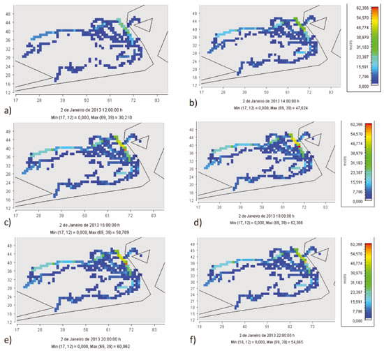 ![]() Figura 5. (a) perfil de CO às 12 h; (b) perfil de CO às 14 h; (c) perfil de CO às 16 h; (d) perfil de CO às 18 h; (e) perfil de CO às 20 h; (f) perfil de CO às 22 h