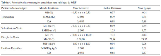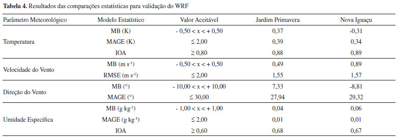 Como observado na Tabela 4, o único parâmetro meteorológico que não foi bem calculado pelo WRF foi a velocidade do vento na região de Nova Iguaçu. Para o método estatístico MB, os desvios deveriam ser menores que 0,5 e o valor calculado foi de 0,89. Os resultados indicam uma superestimativa dos valores simulados em relação ao medido pelas estações meteorológicas. Características locais influenciam esses resultados: a estação Jardim Primavera está localizada em uma área sem grandes interferências das construções urbanas, já a estação de Nova Iguaçu está situada no centro da cidade de Nova Iguaçu e diversos fatores de micro meteorologia local podem interferir na medição dos dados dessa estação. De acordo com os resultados das Figuras 3a, 3b, 4a, 4b e da Tabela 4, o modelo WRF foi corretamente adaptado ao cenário da RMRJ.
