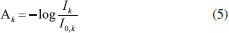 The values of R, G, B, L, a, and b were all nonlinear with the concentration of vitamin C. The correlation coefficient of the fitting curve between the value of R and vitamin C concentration is 0.9961 using the exponential fitting method, which is the highest correlation coefficient between the R value and vitamin C concentration. Linear fitting results To obtain the linear relation curve, we needed to further process the color component. The RGB and L values corresponding to the collected solution image were processed by calculating the absorbance, according to equation (5): ![]() where Ak is the absorbance of a given channel k (red, green, blue, or brightness); Ik is the intensity of a given channel k; and I0,k is the blank intensity of a given channel k. Building the fitting curve between the obtained absorbance value and vitamin C concentration (see Figure 5), we find that the calibration curve of the color component and vitamin C concentration is linear. Among the RGB and L values, the linear regression constructed using the G-resolved absorbance value is y = 0.0484x + 0.7771, and the correlation coefficient R2 reaches 0.9983.