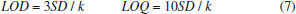 The predicted curve of the multivariate data fit of the CIELab value to the vitamin C concentration is consistent with the trend of the actual concentration value with a smaller error. The predicted curve obtained by fitting the multivariate second-order polynomial of the CIELab value to the vitamin C concentration is the closest to the actual concentration value. Fitted models of the vitamin C concentration and the R, G, and CIELab values were obtained using exponential fitting, linear fitting, and multivariate second-order polynomial fitting, respectively. The three fitting methods were compared, and it was found that linear fitting improves the fitting effect. The predicted concentration of the multivariate second-order polynomial fitting of the CIELab values and the concentration multivariate were very close to the actual concentration, and the error was small. Multivariate fitting gave further play to the processing power of the computer and improved measurement accuracy. Therefore, the fitting curve between the CIELab values and the vitamin C concentration was chosen as the standard curve by fitting the second-order polynomial of multiple variables. LOD, LOQ, and measurement results of the standard vitamin C solution The limit of detection (LOD) refers to the smallest analyte (the analyzed sample component) concentration or mass that can be detected or quantified with a specified degree of certainty.37 The limit of quantification (LOQ) refers to the smallest analyte concentration or mass that can be quantitatively analyzed with reasonable reliability by a given procedure.38 According to the International Union of Pure and Applied Chemistry regulation, the LOD and LOQ can be calculated using formula (7). ![]() where SD is the standard deviation of the measured signal values of the blank samples (n = 10), and k is the standard curve slope. The concentration of vitamin C was fitted with the Lab, G, grayscale, and log-grayscale values to obtain the adjusted R2, LOD, and LOQ. The aforementioned values and vitamin C concentration ranges are listed in Table 4.