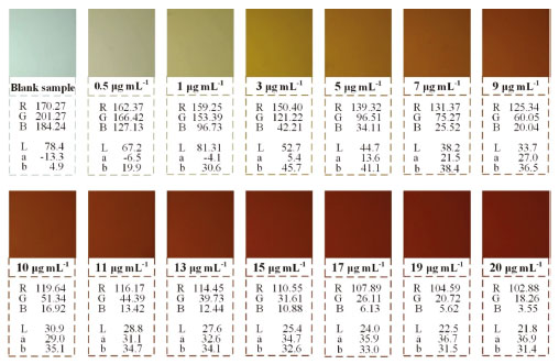 The Lab values converted by the image processing software were compared with the Lab values converted by the Adobe Photoshop CC 2019 software, and the results were found to be identical. The RGB values and brightness value L of the image gradually decreased, while the a and b values generally increased but also fluctuated. Therefore, the vitamin C concentration can be determined by the change of color component.