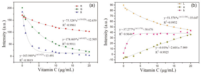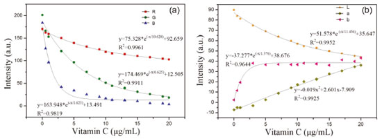 ![]() Figure 4. Fitting results of vitamin C concentration and corresponding color components: (a) vitamin C fitted with RGB, (b) vitamin C fitted with Lab