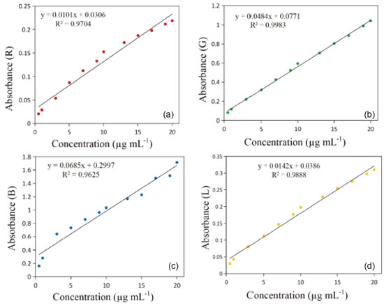 ![]() Figure 5. Fitting curve constructed by the absorbance value and vitamin C concentration using the: (a) red channel, (b) green channel, (c) blue channel, and (d) brightness channel