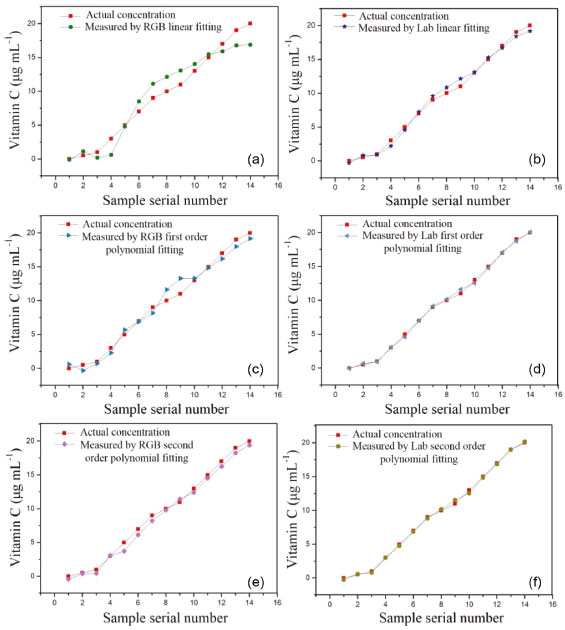 ![]() Figure 6. Comparison between the actual and predicted RGB and Lab predicted concentrations of vitamin C using different fitting methods: (a)-(b) multiple linear fitting, (c)-(d) multiple first-order polynomial fitting, and (e)-(f) multiple second-order polynomial fitting