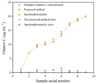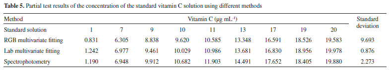 All values provided good fits, with the Lab value providing the best one. All LODs were below 0.5 μg mL-1, with the Lab values having the lowest one, facilitating the analysis of samples containing very low concentrations levels. Contrast with other methods Comparative experiment versus the standard method To verify the accuracy of the proposed method, an experiment was designed to compare the obtained results with those of a spectrophotometer. The spectrophotometer used in this comparative experiment is a typical visible spectrophotometer (model 721G, INESA Analytical Instrument Co., Ltd., Shanghai, China, http://www.inesa-instrument.com). The absorbance of different concentrations of the vitamin C standard solution was measured at the 475-nm wavelength. Linear fitting of the absorbance determined by the spectrophotometer with different concentrations of the vitamin C standard solution was carried out to obtain the standard curve, shown in Figure 3S. The standard curve is y=0.1221x+0.0287 with an R2 of 0.9968. In the concentration range of the 0-20 μg mL-1 vitamin C solution, the concentration of vitamin C has a good linear relationship with the absorbance, which ensures the measurement accuracy in subsequent comparative experiments. The standard vitamin C solutions of different concentrations were determined by both the spectrophotometric and digital camera methods. Partial comparison results are presented in Table 5.