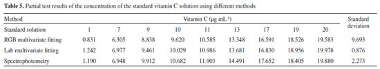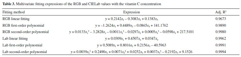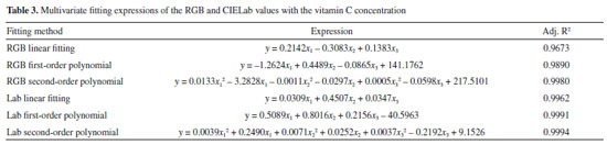 CONCLUSIONS In this study, a method of measuring vitamin C concentration using a digital camera and organic compound color reaction was proposed. The RGB and CIELab values of the solution were obtained by developing a measurement device and implementing image processing software. The relationship between various color components and vitamin C concentration was determined, and the corresponding curves were constructed using nonlinear, linear, and multivariate fitting. The relationship curve constructed by multivariate fitting enhances computer processing, optimizes the fitting effect, and improves the measurement accuracy. The content of vitamin C in the standard solution and actual fruits and vegetables was determined by the proposed method and compared with that obtained by the spectrophotometric method. The comparison results show that the method of the digital camera combined with the color reaction of colored compounds is more accurate than the spectrophotometric method. During the determination of the vitamin C content in real fruits and vegetables, the results of an independent sample t-test showed that there was no significant difference between the proposed method and the spectrophotometric method. Furthermore, the proposed method has the advantage of high accuracy and simple instrumentation design. Therefore, it can replace the traditional spectrophotometric method for the measurement of vitamin C concentration in fruits and vegetables while reducing the measurement cost.