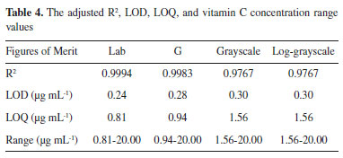 I. College of Computer Science and Technology, Huaibei Normal University, Huaibei 235000, P.R. China Recebido em 25/05/2020 *e-mail: liurise@139.com In this study, we propose a novel method to determine the vitamin C content in fruits and vegetables. The proposed method exploits the image and data processing abilities of computers by coupling a digital camera and a color reaction. An image acquisition device was developed to collect the image information of the solution to be measured after the color reaction. The corresponding RGB and Lab color components were obtained by an image analysis software. Further, the standard curves of the vitamin C concentration and color component were established by nonlinear, linear, and multivariate data fitting. The detection range was 0.81-20.00 μg mL-1 (R2 = 0.9994), LOD was 0.24 μg mL-1, LOQ was 0.81 μg mL-1, accuracy was 98.95%, and precision was determined with an RSD of 0.73%. A comparison of the results confirmed that the proposed method's accuracy was higher than that of the spectrophotometric method. The proposed method has a simple design and facilitates easy operation, and the cost of the equipment is only US$ 31.43. Therefore, it can replace the traditional spectrophotometric method for the determination of vitamin C content in fruits and vegetables and is highly applicable in the food, chemical, and medical fields. INTRODUCTION Vitamin C, also known as ascorbic acid, is a water-soluble vitamin with strong antioxidant activity. It can optimize cell and tissue levels to prevent and treat respiratory and systemic infections.1 Vitamin C deficiency results in impaired immunity and higher susceptibility to infections. A high dose of vitamin C can be used as an inexpensive, efficient, and multifaceted antioxidant, which can prevent or restore microcirculation disorders, protect against oxidative stress induced by ischemia, sepsis, or burns, and alleviate organ damage and dysfunction.2 Vitamin C is synthesized by a variety of organisms of the animal and plant kingdoms. However, humans, other primate animals, and guinea pigs cannot produce this vitamin.3 Consequently, when humans do not ingest vitamin C through their diets, a deficiency state occurs with a wide spectrum of clinical manifestations. Clinical expression of vitamin C deficiency, i.e., scurvy, is a lethal condition unless appropriately treated. Thus, humans must ingest vitamin C to survive.4 A very small daily intake of vitamin C (10-15 mg/day for an adult) is required to avoid deficiency and scurvy.5 However, excessive intake of vitamin C can lead to secondary oxalidosis, resulting in kidney damage.6 Further, excessive intake of vitamin C may induce obesity.7 Therefore, to effectively control the daily intake of vitamin C, the quantitative determination of its content in fruits and vegetables is crucial. At present, the main methods for the determination of vitamin C content include titration, spectrophotometry,8 fluorometry,9 high-performance liquid chromatography (HPLC),10 and electrochemical analysis.11 The titration methods mainly include direct iodometry12 and the 2,6-dichloroindophenol method.13 The iodometric method uses starch as an indicator and an iodine standard solution to titrate the vitamin C solution. When vitamin C is completely oxidized, the excessive iodine will react with the starch causing the solution to turn blue and indicating the end point of titration. Depending on the amount of iodine consumed in the experiment, the content of vitamin C in the tested sample can be calculated. In the second method, 2,6-dichloroindophenol is used as an indicator. The redox titration of the vitamin C solution is conducted using a blue 2,6-dichloroindophenol solution, which is subsequently reduced to a colorless solution by vitamin C. When the end point of titration is reached, the redundant 2,6-dichloroindophenol appears as light red in an acidic medium. The content of vitamin C in the solution is calculated from the consumption of 2,6-dichloroindophenol. The method is convenient and fast, but the reaction process is easily disturbed by other reducing substances; therefore, the measurement accuracy is low.14 The advantages of the spectrophotometry, fluorescence, and HPLC methods include high sensitivity, good selectivity, rapid determination, and no influence of color. However, the required equipment is expensive and bulky, which is unsuitable for people without laboratory training. Commercial spectrophotometers are expensive and have low sensitivity and specificity. Therefore, several other substances may interfere with the chromogen or enzyme used and reduce the accuracy of the measurement.15,16 The procedure and instrumentation of the electrochemical method are relatively simple; the sample pretreatment requirements are low, the response is fast, and the method is cost efficient. The amperometric method also exhibits the above-mentioned characteristics and has high sensitivity; however, the complex medium may easily interfere with the electrochemical method during vitamin C content determination.17,18 In recent years, advances in computer vision, open source technology, and other technical fields have enabled the development of new analytical methods based on digital images that can be widely used in measurement applications. These methods are often referred to as digital image based (DIB or DIA) methods. The DIB method usually uses images captured from colorimetric or luminescent reactions promoted by a reagent and an analyte with selective interaction to determine the concentration of the analyte in a sample.19 This noninvasive, low-cost method features a wide dynamic range, high sensitivity, and low waste generation during experiments, which conform to the principle of green chemistry. Owing to these favorable characteristics, the DIB method has been applied to various scientific fields. For example, in the field of biology, a DIB-based method was developed to determine 