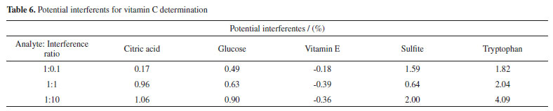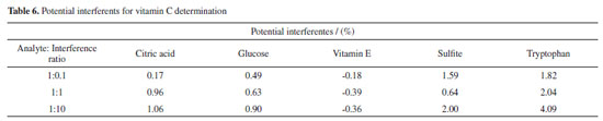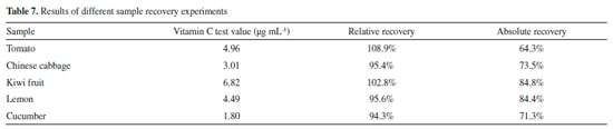 It can be seen that the trend of vitamin C concentration measured by the proposed method is consistent with the standard concentration, has a high degree of coincidence, and the measurement error is smaller than that measured by the spectrophotometric method. With the help of the powerful image and data processing technologies, the instrument design is simplified and the measurement accuracy is improved. Further, the measurement accuracy is improved through multilinear fitting, which combines the multiple color components and reduces random error. Determination of vitamin C content in fruits and vegetables To verify the practicability of the design, the proposed method and a 721G visible spectrophotometer were used to determine the content of vitamin C in several typical fruit and vegetable samples. Extraction of vitamin C The national standard method (i.e., GB method) was used to extract vitamin C.39 The edible parts of fruits or vegetables were weighed at 40 g and put into a homogenizer. Then, 40 g of 1% oxalic acid extract solution was added, and the mixture was quickly mashed into a homogenate. A sample of the homogenate was accurately weighed (10-40 g, accurate to 0.01 g) in a beaker and then transferred to a 100 mL volumetric flask with 1% oxalic acid extract solution. The solution was diluted to scale, shaken well, and filtered. If the filtrate was colored, 0.4 g of kaolin was added for each gram of the sample for decolorization. Subsequently, the filtrate with kaolin was re-filtered to eliminate the interference of the kaolin color with the color of the fruit and vegetable solution. Finally, 15 mL of filtrate was placed into a centrifugal tube, and the filtrate was centrifuged for 5 min at 4,000 r min-1; then, the samples of vitamin C for different fruits and vegetables were obtained. Determination of vitamin C First, the proposed method was used to determine the vitamin C content of commercially available tablets to calibrate the sample standard. In the actual measurement of the vitamin C content, 8.8 mL of the supernatant of each sample extracted from the fruits and vegetables was added to a 15-mL test tube. Then, 0.6 mL of the 4.0 mg mL-1 o-phenanthrene solution and 0.6 mL of the 2.4 mg mL-1 ferric ammonium sulfate solution were added. After the sample solution was stable, the solution was placed in a colorimetric dish. The colorimetric dish was placed in a designed image acquisition device to obtain the image of the reaction solution. The RGB and CIELab values of the solution were obtained by the image processing software. The color information of several samples is shown in Figure 4S. After the chromogenic reaction, the color information of some fruit and vegetable samples was collected by the digital camera, and the corresponding RGB and CIELab values were obtained. Under the same conditions, the content of the above vitamin C samples was determined by spectrophotometry and compared to the content determined by the proposed method to verify accuracy. Interference and recovery assays Foreign substances such as sugar, amino acids, vitamins, and reducing acids were added to the standard 9 μg mL-1 vitamin C solution to verify whether these substances affected the measurement results of vitamin C. Moreover, a recovery experiment was carried out to ensure that the matrix effect did not affect the results. Table 6 lists the vitamin C concentrations determined after the addition of different concentrations of foreign substances.