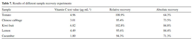 The results indicated that the addition of citric acid, glucose, vitamin E, and tryptophan at any concentration did not affect the determination of vitamin C content. However, when sulfite was added into the solution in a ratio of 1:10, the vitamin C concentration was slightly higher. However, the relative error of the vitamin C concentration did not exceed 5%, and the content of sulfite in the actual fruit and vegetable samples was low; thus, it was confirmed that these substances did not interfere with the experimental results. To verify the impact of the matrix effect in fruits and vegetables, the relative recovery of different samples was obtained, and the absolute recovery was calculated to obtain the extraction efficiency. Table 7 summarizes the experimental results for different fruits and vegetables. The results of the recovery experiments of different samples showed that the relative recovery rate was 94.3%-108.9%, indicating that the matrix effect in different samples had no significant influence on vitamin C content. The absolute recovery rate is 64.3%-84.8%; therefore, the experimental results are considered satisfactory.