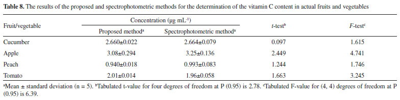 Determination and comparison of actual samples The content of vitamin C in fruit and vegetable samples was determined by both the proposed and spectrophotometric methods; the results are summarized in Table 8. SPSS software was used to test the results of the two methods using the Student's t-test and variance ratio F-test. The error difference between the proposed and spectrophotometric methods is small. The results were statistically evaluated in terms of the Student's t-test and variance ratio F-test, and the values calculated were found to be less than the tabulated values at the 95% confidence level, indicating no significant differences in the accuracy and precision between the two methods. Additionally, the results acquired by the proposed method follow the same trend as those of the spectrophotometric method.
