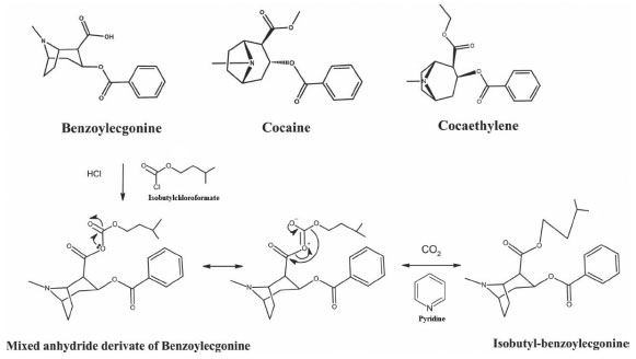 ![]() Figure 1. Chemical structure of COC, CE and chemical reaction showing the mechanism for the formation of isobutyl-BZE