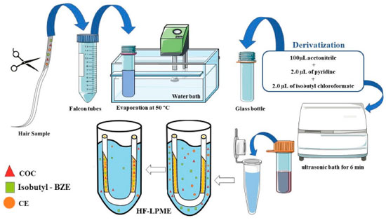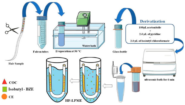 ![]() Figure 2. Sample preparation process showing the washing, derivatization and HF-LPME for COC, Isobutyl-BZE and CE