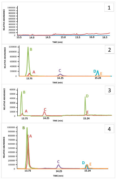 ![]() Figure 3. Chromatograms GC-MS obtained from HF-LPME in hair samples. Where: 1) Blank sample 2) LOQ quantification ions chromatogram: A- COC (m/z 182); B- COC-d3 (m/z 185); C- CE (m/z 196); D- BZE isobutyl ester-d3 (m/z 227); E- BZE isobutyl ester (m/z 224). 3) LOQ confirmation ions chromatogram: A- COC (m/z 272); B- COC-d3 (m/z 275); C- CE (m/z 272); D‑ BZE isobutyl ester-d3 (m/z 275); E- BZE isobutyl ester (m/z 272). 4) Authentic sample chromatogram: A- COC (m/z 182); B- COC-d3 (m/z 185); C- CE (m/z 196); D- BZE isobutyl ester-d3 (m/z 227) and E- BZE isobutyl ester (m/z 224). Results of the concentrations found for all analytes were: COC - 8.5 ng mg-1, CE - 0.6 ng mg-1 and BZE - 2.1 ng mg-1