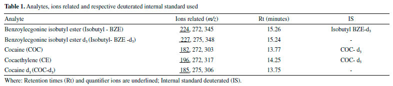 EXPERIMENTAL Chemicals and reagents Standard solutions of COC, BZE and CE (1.0 mg mL-1 in methanol), along with their deuterated internal standards COC-d3 and BZE-d3 (1.0 mg mL-1 in methanol) were purchased from Cerilliant Corporation® (Round Rock, TX, USA). Anhydrous sodium bicarbonate (NaHCO3) and hydrochloric acid (HCl) were purchased from Anidrol® (Diadema, Brazil). Potassium carbonate (K2CO3) was supplied by Labsynth® (Diadema, Brazil). Pyridine was purchased from Vetec® Química Fina (Rio de Janeiro, Brazil). Isobutyl chloroformate and dihexyl ether were supplied by Sigma-Aldrich® (St. Louis, MI, USA). Methanol, acetonitrile and dichloromethane were purchased from Merck® (Darmstadt, Germany). Deionized water was supplied by Milli-Q system, Millipore® (Barueri, Brazil). Working solutions were prepared through adequate dilution of the stock solutions with methanol for final concentrations of 10 µg mL-1 and 1 µg mL-1. All solutions were stored in a freezer at -20 ºC. HF-LPME devices, Accurel KM polypropylene Q3/2 hollow fibers (600 µm i.d., 200 µm wall thickness and 0.2 µm pore size) were supplied by Membrana® (Wuppertal, Germany). GC-MS analysis The analyses were carried out by using a TRACE 1300 GC System Gas Chromatograph coupled to a Thermo Scientific® ISQ Series quadrupole mass-selective detector (MSD) (Thermo Fisher Scientific, Milan, Italy), with the aid of an AI 1310 automated analyzer. Separation of the analytes was done by using a capillary column (30 m x 0.25 mm x 0.25 μm) with 5% of Phenyl Polysilphenylene-Siloxane (TR-5MS), supplied by Thermo Scientific® (Milan, Italy). The temperature of the injector port was 250 °C, and the temperature of the interface was 280 °C. The oven ramp was set to initialize at 90 °C for 1 min, and then increase in 15 °C min-1 until reaching 250 °C, kept for 2 min and then, increasing again in 25 °C min-1 reaching up to 280 °C, kept for 2 min, with the whole process totaling approximately 17 min. The carrier gas (helium) was adjusted to a constant flow of 1.0 mL min-1. The mass spectrometer was operated via electron impact (EI). Qualification and quantification of ions were performed in the selected ion monitoring (SIM) mode, and they were chosen based on selectivity and abundance, in order to maximize the signal - noise in the extracts prepared. The selected ions (underlined quantification ions) are shown in Table 1.