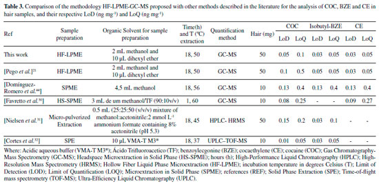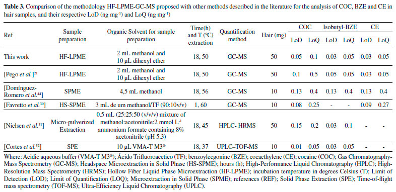 This method showed to be linear, within all the linear curve adopted for the analytes with a correlation coefficient (r) above 0.99. According to recommendations by the Society of Hair Testing (SoHT), the LoQ was deemed to be adequate for this study, since the cut off value for COC and its biotransformation products in hair is 0.5 ng mg-1 and 0.05 ng mg-1, respectively.27 Most of the values found in this study were lower, and therefore better, when compared to other studies.21,22 Homoscedasticity was determined by the Lack of Fit test for evaluating the presence of any abnormal value in the residues and verifying the model adjustment. Lack of Fit (p value) was superior to 0.05, indicating that well-adjusted models were obtained for all analytes (Table 2). Both intra-day and inter-day precision met the criteria established by international guidelines. The coefficients of variation (% CV) obtained were lower than 15% for all concentrations analyzed, except for inter-day precision of the low control (0.3 ng mg-1) of the analyte COC, in which value obtained was higher than 15% (17.86%). However, the guidelines allow values lower than 20% for such concentration.26 Besides, this quality control is lower than the cut off (0.5 ng mg-1) for the analyte in question, and it is not a reference value for drugs consumption. Additionally, intra-day accuracy values ranged from -6.2 to 16.3%, and inter-day accuracy varied from -6.2 to 17.6%. The highest precision and accuracy values refer to CE, and that is probably due to the fact that it was the only substance without an isotopic standard of the analyte itself, since COC-d3 was used. LoD and LoQ obtained by this study can also be considered satisfactory. This data is even more noticeable when compared to analytical methodologies published by other authors, in the same biological matrix and with the same analytes analyzed, as shown by Table 3.21,28-32 In one of these studies, which was carried out through Headspace Solid Phase Microextraction (HS-SPME) and GC-MS, the LoD values obtained were 0.08 ng mg-1 for COC and 0.09 ng mg-1 for CE.29 In another study using HS-SPME-GC-MS, the LoD found for COC and CE were 0.13 ng mg-1 and the LoQ was 0.25 ng mg-1 for COC and 0.27 ng mg-1 for CE,33 that is, higher than the technique performed by our study.