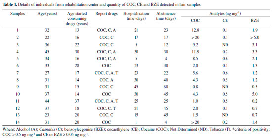 Table 4 presents the concentrations of all analytes found in the 14 samples analyzed, which were positively confirmed for COC and BZE. Only three samples were not positive for CE, which matches the reports by these patients, who stated not to consume alcohol and cocaine simultaneously. Concentrations obtained for COC ranged from 0.8 to > 20 ng mg-1. Regarding BZE, concentrations varied from 0.2 to > 5 ng mg-1. The period during which they had been taking part of the rehabilitation program ranged from 1 to 45 days by the time they were interviewed. All the samples analyzed were provided by volunteers who claimed to have used cocaine along with other drugs. The interviewees stated to have made use of the drug (COC) for the last time between 4 and 60 days before the interview (Table 4). Therefore, in some samples, analytes presented concentrations that were high than the superior limit of quantification stablished within the method. For the CE analyte the highest values obtained were 0.6 ng mg-1. Figure 3.4 represents a positive result, in which the concentrations obtained were 8.5 ng mg-1, 0.6 ng mg-1 and 2.1 ng mg-1 for COC, CE and BZE, respectively. A study carried out by Gambelunghe et al.,34 applied to 90 hair samples, classified the use of cocaine at mild (0.5-3 ng mg-1), moderate (3.1-10 ng mg-1) and severe (10.1-40 ng mg-1). According this classification, at the present study 5 samples were fit at mild use, 5 classified within the moderate category, and 4 in the severe use class. This information can be usseful in the treatment process, as care must be intensified in chronic users classified as moderate and severe. The individuals who claimed early and continuous uses showed greater concentrations of COC, thus proving that hair samples are an adequate biological matrix for analyzing drugs. Moreover, the data collected had been available for use at the rehabilitation facility so as to assist in the treatment of chemical dependents. The use of hair sample over conventional samples is preferable due to the fact that its collection is simple, the procedure is not invasive, and, in forensic situations, it can be done under strict supervision so as to avoid adulteration and samples replacement.8,9 Treatments provided by rehabilitation clinics can benefit society and support the rehabilitation of chemical dependents, as well as help to control and, eventually, overcome addiction. It is evident that chemical dependency treatments combined with monitoring the use of drugs are pivotal. Thereby, the interview conducted in rehabilitation clinics, associated with drug analysis, is a means by which the profile of the interned patient can be known, as example, at what age the patient started the consume of drugs and which drugs are the most used. These allowing devising prevention strategies to minimize relapse or even prevent the death of users.
