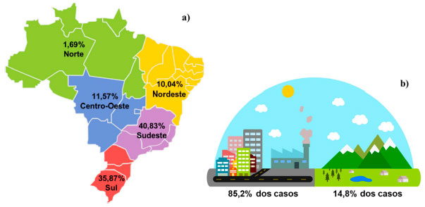 A incidência de acidentes é bem maior na Região Sul, uma vez que apenas 14,3% da população está nessa região. No Centro-Oeste, os acidentes (11,6%) também têm incidência maior que o percentual da população na região (7,8%). Com cerca de 3-4 vezes menos acidentes que o percentual da população da região, o Norte e o Nordeste são também as regiões brasileiras em que menos de 80% da população está nas cidades. No Nordeste, são mais de 26% da população em áreas rurais, contra menos de 7% no Sudeste.12 O baixo número de casos nas regiões Norte e Nordeste pode ser associado ao conhecimento tradicional da população das zonas rurais quanto às espécies de plantas e seu uso para diversas finalidades, como no caso de plantas medicinais, que por vezes é o único recurso terapêutico disponível em muitas comunidades e grupos étnicos.14,15 A urbanização, globalização e industrialização são processos que ocasionam alterações de valores e conceitos, contribuindo para que ocorram transformações naturais, o que pode resultar na perda de elementos e conhecimentos tradicionais importantes, que normalmente são transmitidos de geração em geração.15 Essa perda de conhecimentos tradicionais é refletida nos números das intoxicações por plantas tão desconformes entre zonas rurais e urbanas (Figura 3). Essas mesmas estatísticas mostram que os casos de intoxicação doméstica mais comuns ocorrem com cosméticos, alimentos e plantas, devido ao fácil acesso a esses componentes por crianças e animais domésticos (Figura 4).9