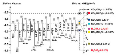 ![]() Figura 5. Estrutura eletrônica de diversos semicondutores com os valores das bandas de valência e condução e a comparação com potencial de redução das principais reações de interesse da conversão de CO2.117 (Reproduzida com a permissão da John Wiley and Sons)