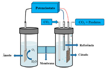 ![]() Figura 7. Representação esquemática de uma célula eletroquímica em H para redução do CO2 em diferentes produtos no cátodo e oxidação da água no ânodo