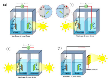 REDUÇÃO DE CO2 EM DISPOSITIVOS FOTOELETROQUÍMICOS Uma estratégia promissora para superar os problemas dos processos fotoquímico e eletroquímico é combiná-los num processo fotoeletroquímico.254 De modo geral, esse processo pode reduzir o consumo de energia elétrica em comparação com a redução eletroquímica do CO2, devido à reação espontânea conduzida pela energia solar no ânodo e/ou cátodo. Em comparação com a fotocatálise, pode-se alcançar eficiência muito maior na redução do CO2, já que o potencial externo aplicado conduz à separação do par elétron/buraco fotogerado no semicondutor, i.e., os elétrons são conduzidos para o cátodo, enquanto os buracos são concentrados no ânodo evitando a recombinação desses, de modo que a principal limitação da fotocatálise é superada.255-257 Assim, o processo fotoeletroquímico combina benefícios de ambos os processos e pode superar suas limitações. Os sistemas fotoeletroquímicos utilizados nas reações de redução de CO2, contém três eletrodos: eletrodo de referência, trabalho e contra eletrodo, esses dois últimos separados por membranas de troca iônica, podendo ser catiônica ou aniônica.256 Além disso, a configuração das células fotoeletroquímicas podem ser empregadas em 4 diferentes tipos, representados na Figura 9: (i) sistema utilizando fotoânodo e cátodo metálico; (ii) sistema utilizando fotocátodo e ânodo metálico; (iii) sistema utilizando fotocátodo e fotoânodo; e (iv) sistema utilizando eletrodos metálicos conectados a células fotovoltaicas, como os dispositivos multijunções (tipo Tandem), silício ou perovskita.256,258