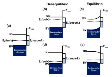 ![]() Figura 10. Níveis esquemáticos de energia eletrônica perto da superfície de um semicondutor limpo: (a) semicondutor (intrínseco); (b) antes do equilíbrio e (c) em equilíbrio entre o bulk do tipo n e sua superfície; (d) antes do equilíbrio e (e) equilíbrio entre o bulk do tipo p e sua superfície. Adaptado de Zhang et al.261