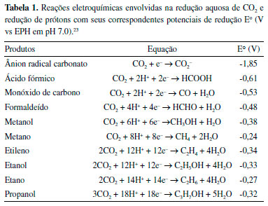 Na catalise heterogênea, um aspecto importante da transferência de elétrons para a molécula de CO2 é a posição da banda de condução dos semicondutores, que influencia na seletividade dos produtos gerados. (Tabela 1).22 A redução ocorre em várias etapas, envolvendo a participação de 2, 6, 8 ou 12 elétrons e prótons. Isso torna a cinética do processo extremamente complexa e, além dos desafios termodinâmicos, essa reação tende a apresentar uma cinética lenta. Diversos produtos podem ser gerados, incluindo compostos C1, como moléculas CO, CH4, HCOOH, CH3OH, HCHO e C2, como CH2CH2, C2H5OH e CH3COOH, o que torna o controle da seletividade bastante difícil.23