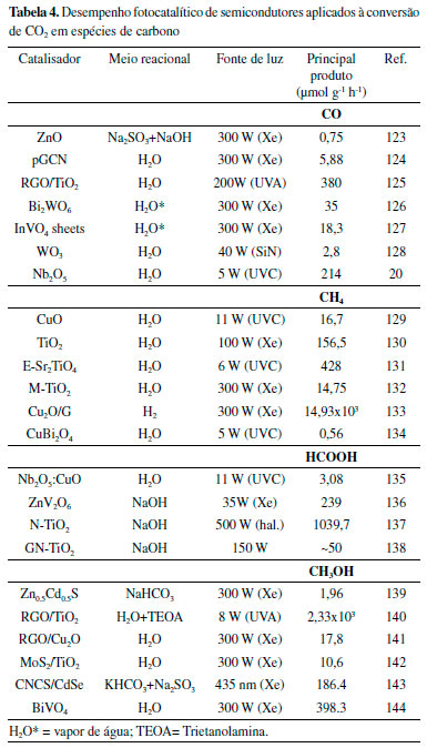 Catalisadores heterogêneos como os semicondutores metálicos (CuO, TiO2, SnO2, Nb2O5 entre outros) e não metálicos (grafeno, C3N4, etc),117 apresentam em geral bom custo/benefício, são facilmente recuperados e reativados, e em princípio, podem ser ativados por radiação solar. No entanto, ainda apresentam baixa atividade e seletividade. Adicionalmente, a reação de redução de CO2 compete com a evolução de H2 em meio prótico, portanto, catalisadores eficientes devem exibir alta atividade para conversão de CO2 com atividade baixa ou desprezível para evolução de H2.118 No processo fotocatalítico quando um fóton incide sobre um semicondutor, com uma energia maior ou igual ao seu bandgap, ocorre a absorção do fóton, resultando na transição de um elétron da banda de valência para a banda de condução e geração de um buraco na banda de valência.119 O potencial de redução de um elétron fotoexcitado é determinado pelo nível de energia na parte inferior da banda de condução, e o poder de oxidação do buraco é determinado pelo nível de energia superior da banda de valência (Figura 5). Em uma reação fotoquímica típica, os elétrons e os buracos fotogerados são separados e migram para a superfície do fotocatalisador, na qual ocorrem as reações redox. Em qualquer caso, a posição da banda de condução do semicondutor deve estar acima do potencial redox do CO2. Se a posição da banda de valência estiver abaixo do potencial redox da água, ela pode ser utilizada como fonte protônica. Portanto, materiais com o alinhamento de banda adequado podem favorecer a reação redox antes que os portadores de carga sofram recombinação.120 Outros aspectos importantes incluem o bandgap adequado para absorver a energia solar em uma larga faixa do espectro; uma grande área de superfície ativa para a adsorção máxima de CO2/CO32-; resistência à fotocorrosão; alta eficiência fotocatalítica; e baixa toxicidade. Os óxidos metálicos têm sido amplamente utilizados como fotocatalisadores da redução de CO2 devido à sua estabilidade e resistência à fotocorrosão sob irradiação. As propriedades intrínsecas dos óxidos metálicos desempenham um papel crítico na determinação de sua viabilidade. Dois grupos principais têm sido estudados: óxidos de metais de transição em configuração d0 (Ti4+, Zr4+, Nb5+, Ta5+, V5+ e W6+); e óxidos de metal do grupo principal em configuração d10, com fórmula geral MyOz (M = Ga, Ge, In, Sn ou Sb).121 Na Tabela 4 são apresentados alguns dos principais semicondutores com metais de transição aplicados na fotoredução de CO2 para produção de CO, CH4, HCOOH e CH3OH, bem como suas respectivas taxas de conversão. As reações reportadas foram realizadas sob condições reacionais e/ou geometrias de reatores diferentes, o que pode influenciar diretamente no rendimento e na seletividade dos materiais, de modo que comparações diretas dos valores numéricos podem levar a conclusões errôneas a respeito da estabilidade/eficiência de cada um dos catalisadores.