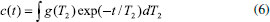 Diversos softwares realizam esse processamento, alguns com acesso gratuito e outros sendo apenas fornecidos com as licenças pelas empresas fabricantes dos espectrômetros, cada qual com diferentes caraterísticas de processamento. Muitos algoritmos se propõem a resolver esse problema inverso mal-posto, como o CONTIN (CONTINuous distribution),18 o UpenWin (Uniform PENalty),19,20 Butler-Reeds-Dawson (BRD),21 Decomposição em Valores Singulares truncado (TSVD),13 NNLS (non-negative least squares),17 PDCO (Primal-Dual interior method),22 entre muitos outros. Nosso objetivo aqui é discutir os conceitos teóricos fundamentais e distribuir na comunidade de RMN brasileira um código de simples utilização, gratituto para pesquisa e ensino, desenvolvido para realização da ILT de sinais de RMN-DT na plataforma do software Origin Lab23 e do Matlab, que são softwares muito utilizados pela nossa comunidade, visando o processamento de experimentos do tipo CPMG, Inversão Recuperação, Saturação Recuperação, entre outros. Nas próximas seções apresentamos inicialmente uma descrição matemática do processamento realizado. A seguir são apresentados alguns resultados obtidos com sinais simulados e experimentais, e por fim dedicamos uma seção para detalhar o procedimento para utilização do programa desenvolvido. Um vídeo com explicação sobre instalação e utilização do código pode ser encontrado no link: https://youtu.be/aobB016VhXs ou requisitado no e-mail tiagobuemoraes@gmail.com Problema Inverso na RMN-DT Muitos problemas na física são descritos por equações diferenciais cuja solução é um sinal, s(t), que decai exponencialmente com o tempo, do tipo ![]() em que A é a amplitude do sinal, B é uma constante que determina a linha de base e γ sua constante de decaimento. O inverso desse fator, T = 1/γ, tem unidade de tempo e é denominado constante de tempo do decaimento. Dentro do contexto da RMN-DT, tipicamente encontramos experimentos que resultam em sinais que decaem ou crescem exponencialmente no tempo, em que a constante de tempo que determina a taxa desse processo é dada pelos tempos de relaxação T1 e/ou T2. Um exemplo dessa situação é numa aquisição de um experimento CPMG, onde o sinal, s(t), começa com amplitude A, decai para zero (B=0) e apresenta tempo de relaxação T2 ![]() Um ajuste mono-exponecial dos dados obtidos nessa situação é suficiente para fornecer as constantes T2, a amplitude A do sinal, e o offset B, caso esse último esteja diferente de zero. Em amostras mais complexas, com vários tempos de relaxação, o sinal CPMG será composto pela somatória dessas componentes ![]() em que A1 é a amplitude do grupo de spins com tempo de relaxação T21, A2 é a amplitude do grupo de spins com taxa de relaxação T22, etc. Vale destacar que as amplitudes An desses sinais estão diretamente relacionadas com a quantidade de spins, naquele grupo, que apresentam aquele repectivo tempo de relaxação T2n. Na análise de sinais com apenas duas ou três componentes exponenciais, muitas vezes é suficiente realizamos simplesmente o ajuste (fitting) com uma função bi-expoencial ou tri-exponencial, como a equação 3, e assim determinar essas amplitudes An e tempos de relaxação T2n. Em sistemas mais complexos com larga distribuição de tempos de relaxação, como por exemplo, uma rocha porosa saturada com água e óleo, apenas a determinação de duas ou três componentes de amplitude An e tempos de relaxação Tn, pode não ser suficiente para caracterização do sistema, uma vez que não temos valores de amplitude e tempos de relaxação singulares (picos estreitos), mas o que temos é uma distribuição larga de tempos de relaxação, que vão corresponder à uma distribuição larga de tamanhos de poros na rocha, e quantidade de água e óleo presente. A Figura 3 resume de maneira ilustrativa o objetivo do procedimento matemático realizado pela Transformada Inversa de Laplace. Na esquerda vemos um sinal do tipo CPMG, representado pelo gráfico das amplitudes dos ecos em função do tempo, que ao ser processado com a ILT resulta no gráfico na direita, revelando o espectro da distribuição de tempos de relaxação T2. Dessa forma, o processamento com a ILT revela a contribuição de diferentes grupos de spins do sistema em análise, onde os dois picos ilustrados na distribuição de T2 podem por exemplo representar: óleo e água presentes em um grão de milho; ou fibras da carne e gordura presentes em um bife; ou dois grupos de tamanhos de poros em rochas, etc. A distribuição obtida no processamento com a ILT pode advir de uma curva de Inversão Recuperação (T1), Saturação Recuperação (T1), CPMG (T2), Difusão, entre outros experimentos, onde o que muda no processamento é a equação (kernel) utilizada na transformação, como será discutido na próxima seção. Descrição matemática da ILT A literatura apresenta diversos métodos matemáticos para realização da inversão desses sinais de RMN-DT, denominados genericamente de ILT pela comunidade científica de RMN. Vale destacar que a "Transformada Inversa de Laplace" aqui tratada é diferente do procedimento de mesmo nome encontrado em livros de Física Matemática.24 Apesar de o nome estar formalmente incorreto no nosso contexto, a origem da utilização desse termo pela comunidade de RMN está relacionada com uma analogia com o procedimento da Transformada de Fourier Inversa. Maiores detalhes dessa história podem ser encontrados no trabalho de Fordham e colaboradores.13 No contexto da RMN-DT, na maioria das sequências de pulsos utilizadas, os sinais adquiridos apresentam caráter de crescimento ou decaimento exponencial e/ou gaussiano, que carregam informações, por exemplo dos tempos de relaxação ou coeficientes de difusão, onde o processamento matemático de inversão é realizado para obter as distribuições com a contribuição de cada componente. Assim, o que den