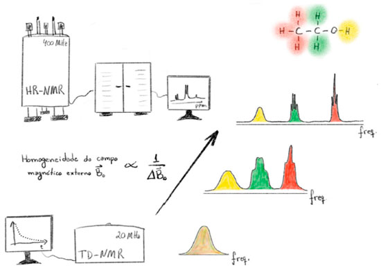![]() Figura 1. Ilustração comparando um espectrômetro de RMN de alta resolução (HR-NMR) com um de baixa resolução (TD-NMR). No equipamento HR-NMR a homogeneidade do campo magnético externo ( ) é alta, pois a variação do campo aplicado na amostra é pequena ( ~ 0), assim podemos obter informação à nível molecular nos espectros, por exemplo identificando os três grupos químicos CH3, CH2 e OH no espectro do etanol. Em sistemas magnéticos com ímãs permanentes, de baixa homogeneidade de campo magnético externo, temos > 0, não apresentando resolução no domínio da frequência para identificação dos grupos químicos. A definição de pode ser consultada na referência T.B. Moraes9. Nos espectrômetros de RMN-DT, métodos de relaxometria são empregados e permitem o estudo de diferentes parâmetros físico-químicos