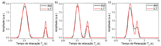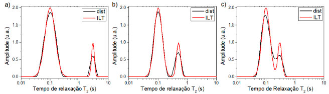 ![]() Figura 7. Comparação da distribuição de tempos de relaxação utilizada para gerar sinal CPMG simulado (dist) em comparação com o sinal obtido (ILT) após processamento com a ILT do correspondente sinal no domínio do tempo em três situações diferentes. Em a) respectivamente picos nas posições 0,1 e 3 segundos. Em b) picos nas posições 0,1 e 0,5 segundos. Em c) nas posições 0,1 e 0,3 segundos