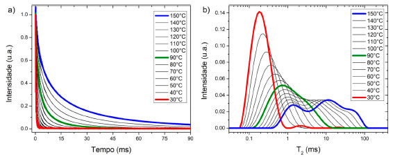 ![]() Figura 9. a) Medidas CPMG de uma mistura de cimento asfáltico de petróleo em função da temperatura, em b) são apresentadas as respectivas distribuições de tempos de relaxação obtidas. Nota-se que em baixa temperatura, o aglomerado é um sistema rígido único com curto tempo de relaxação (~0,2 ms), e conforme sobe a temperatura, seus diferentes componentes ganham mobilidade, evidenciando três grupos com mobilidades distintas em 1 ms, 10 ms e 60 ms
