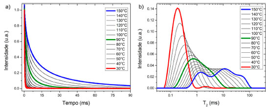 Na Figura 9 são apresentados sinais CPMG experimentais de uma amostra de cimento asfáltico de petróleo (CAP) adquiridos no espectrômetro Minispec ND mq20, Bruker, equipado com um magneto permanente de 0,47 Tesla (19,9 MHz) e sonda de 10 mm. As medidas foram realizadas em treze temperaturas diferentes, entre 30 °C e 150 °C, pelo sistema de controle BVT 3000. A sequência de pulsos utilizada foi CPMG, com τ = 0,1 ms e 10.000 ecos. O processamento ILT utilizou 100 pontos e α = 1.