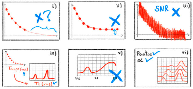 ![]() Figura 2. Sequência de pulsos CPMG representando os ecos formados em vermelho. As amplitudes dos ecos formam a curva de decaimento T2 do experimento (pontos vermelhos), que é então análisada com métodos de ajuste (fitting) do sinal ou através da Transformada Inversa de Laplace (ILT). Em algumas situações o ajuste ótimo dos dados pode ser obtido com diferentes números de exponenciais e valores de T2 e amplitude, sendo ambas as respostas soluções matemática do problema, uma vez que se trata de um problema matemático mal-posto, que admite mais de uma solução