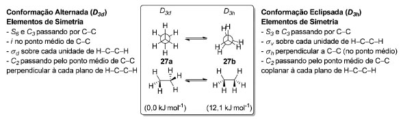Quando diferentes arranjos espaciais de um mesmo composto precisam ser levados em consideração é necessário recorrer à análise conformacional. A importância da simetria para um estudo de análise conformacional reside no fato de as principais evidências espectroscópicas para estudar as espécies envolvidas serem as espectroscopias de Infravermelho e Raman. As absorções de diferentes rotâmeros - e confôrmeros - de uma mesma molécula são distintas nesse tipo de espectroscopia, justamente por não apresentarem o mesmo tipo de simetria, ou seja, pertencerem a grupos pontuais diferentes.52 Comecemos com o etano, o hidrocarboneto de estrutura flexível mais simples. Para o etano (27) existem vários rotâmeros que se encontram em equilíbrio dinâmico. O rotâmero de mais baixa energia é o de conformação alternada 27a (D3d), 12,1 kJ mol-1 mais estável que o rotâmero de mais alta energia de conformação eclipsada 27b (D3h, Esquema 1).