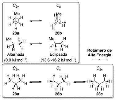 A barreira rotacional para o propano (28) é um pouco mais elevada que para o etano (27, 12-35%), já que o rotâmero eclipsado apresenta repulsão entre um grupo metila e uma ligação σC-H. Em princípio, há ainda a possibilidade de um rotâmero de alta energia adotar uma conformação duplamente eclipsada 28c (C2v) mas, até onde sabemos, não há evidências espectroscópicas para o mesmo.62 As conformações eclipsadas correspondem a máximos na superfície de energia potencial. O n-butano (29) é o primeiro alcano linear a ter o que podemos chamar de confôrmeros, rotâmeros de conformação alternadas correspondentes a mínimos na superfície de energia potencial, mas que apresentam energias diferentes (Esquema 3). A população relativa de um dado confôrmero é determinada por uma distribuição de Boltzmann. Assim, o confôrmero presente em maior proporção no equilíbrio corresponde à estrutura de menor energia livre de Gibbs.