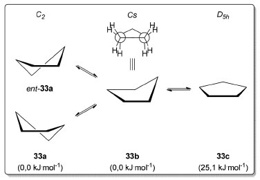 Para o ciclobutano (32), a conformação planar 32b (D4h) corresponde a um máximo de energia em relação à conformação mais estável 32a de simetria D2d,69 onde um dos carbonos do anel está acima do plano formado pelos três outros carbonos em uma inclinação de aproximadamente 30°, adotando uma conformação 6,0 kJ.mol-1 mais estável que a conformação planar 32b (Esquema 5).70 Apesar do ciclopentano (33) possuir uma tensão angular muito pequena, a tensão torsional é suficiente para fazer com que a diferença de energia entre a conformação planar 33c e suas conformações mais estáveis seja de 25,1 kJ.mol-1(Esquema 6).71 O ciclopentano (33) possui duas conformações estáveis, a primeira denominada de envelope 33b (Cs), em que quatro átomos de carbono estão coplanares e um deles está ligeiramente acima (ou abaixo) do plano (D5h). A outra conformação é chamada de meia-cadeira (C2) na qual um carbono está ligeiramente acima e outro ligeiramente abaixo do plano formado pelos outros três carbonos do anel. Essa conformação (C2) existe na forma de dois enantiômeros 33a e ent-33a. As energias dos confôrmeros meia-cadeira e envelope são praticamente idênticas e a barreira de interconversão (pseudorotação) entre os dois é quase nula.72