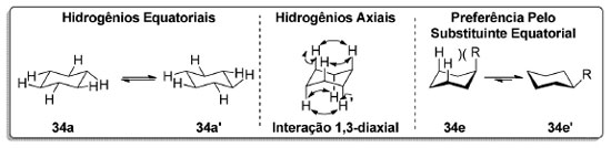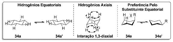 Os hidrogênios no cicloexano (34) não são todos equivalentes. A -90 °C, dois sinais são observados no espectro de RMN 1H do cicloexano-d11 (34-d11) referentes aos hidrogênios em posição axial e equatorial (Esquema 8).77 Entretanto, à medida que a temperatura aumenta, os sinais coalescem, uma vez que a escala de tempo do experimento é muito longa em relação à taxa de interconversão entre os confôrmeros (cadeira 34a e cadeira invertida 34a'). Em cicloexanos monossubstituídos (34e), a repulsão 1,3-diaxial faz com que o confôrmero em que o substituinte está em posição equatorial seja mais estável. Essa preferência conformacional devida a efeitos estéricos pode ser parcial ou completamente revertida na presença de efeitos estereoeletrônicos.78