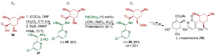 ![]() Esquema 10. Funcionalização estereosseletiva na síntese da (-)-maximiscina (35) por Baran e colaboradores80