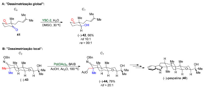 Outro ponto que merece ser destacado é o uso da expressão dessimetrização local. Sharpe e Johnson, na síntese total da (-)-paspalina (40),81 fazem uso da expressão "dessimetrização global" para se referir a dessimetrização enantiosseletiva e "dessimetrização local" para uma etapa de diferenciação de duas metilas diastereotópicas (Esquema 11). Como na segunda etapa substrato e produto apresentam simetria C1, o emprego de tal terminologia não está de acordo com a definição da IUPAC e, portanto, o seu uso não é recomendado.