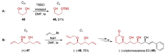 Outra possibilidade é a diferenciação83 de sítios homotópicos em moléculas quirais. A monofuncionalização do diol 4784 que possui eixo de simetria C2, com brometo de alila, forneceu o composto 48 que pertence ao grupo pontual C1, um intermediário na síntese total da (−)-criptomoscatona E3 (49), em 75% de rendimento (Esquema 12B).85 As reações de dessimetrização não-estereosseletivas são processos de monofuncionalização e, portanto, não serão abordadas neste artigo. Já nas dessimetrizações estereosseletivas, a quebra de simetria leva à transformação de uma molécula aquiral em uma molécula quiral. Este tipo de processo pode envolver o emprego de quantidades estequiométricas de um agente de dessimetrização quiral (dessimetrização diastereosseletiva) ou de quantidade estequiométrica de um reagente aquiral na presença de um catalisador quiral (dessimetrização enantiosseletiva, Esquema 9). A dessimetrização estereosseletiva de compostos meso, aquirais devido à presença de um elemento de simetria (σ, i ou Sn), por catálise metálica, organocatálise ou mediante o uso de enzimas aumenta significativamente a brevidade e a eficiência de uma rota sintética. Em uma típica síntese estereosseletiva, um processo enantiosseletivo precede às etapas diastereosseletivas que instalam os centros estereogênicos remanescentes na estrutura desejada. A dessimetrização de compostos meso (Cs ou Ci) inverte a sequência típica dessas etapas (Esquema 13). Por outro lado, a dessimetrização de compostos proquirais ocorre, geralmente, em etapas iniciais da síntese.