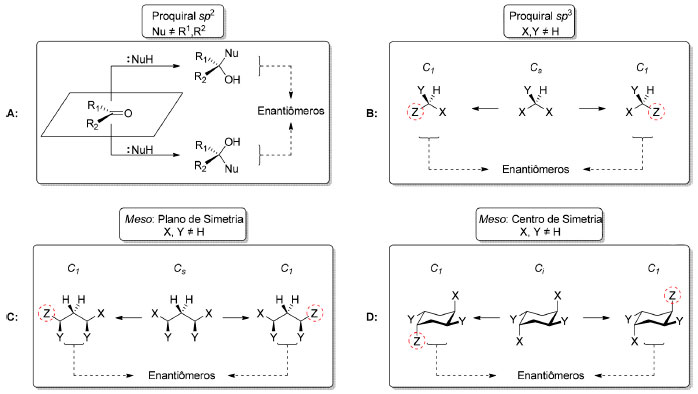 ![]() Esquema 13. Dessimetrizações. A: Compostos proquirais sp2 (não tratados neste trabalho); B: Compostos proquirais sp3; C: Compostos meso contendo plano de simetria (σ); D: Compostos meso contendo centro de inversão (i)