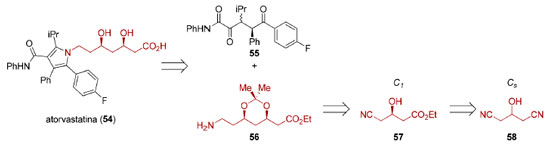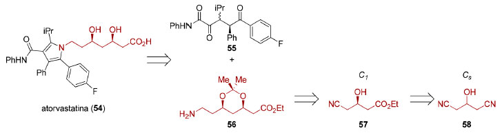 Desde a descoberta que metabólitos de fungos como, por exemplo, compactina89 e lovastatina (Mevinolin® ou Mevacor®),90 juntamente com a estatina semissintética sinvastatina (Zocor®),91 eram capazes de inibir a enzima 3-Hidroxi-3-MetilGlutarato redutase (HMG-CoA), responsável pela redução da (S)-HMG-CoA a (R)-mevalonato e, dessa maneira, inibir a biossíntese de colesterol, essa família de fármacos, conhecida como estatinas, passou a ser amplamente empregada no controle da hipercolesteremia e na dislipidemia. Posteriormente, estatinas sintéticas mais potentes foram desenvolvidas, culminando com a introdução no mercado da atorvastatina (54, Lipitor®), em 1997. Do ponto de vista estrutural, todos esses compostos apresentam uma unidade relacionada ao ácido (R)-3-hidroxiglutárico que é o grupo farmacofórico responsável pela inibição enzimática. A síntese industrial da atorvastina (54) emprega a reação de Paal-Knorr entre uma 1,4-dicetona 55 e uma amina primária 56 contendo os dois centros estereogênicos presentes na estrutura do fármaco. Uma das rotas de preparação da amina 56 envolve a dessimetrização enzimática da 3-hidroxiglutaronitrila 58 para fornecer o ácido (R)-4-ciano-3-hidroxibutírico que foi transformado no éster etílico correspondente 57, permitindo obter a amina primária 56 necessária para a condensação de Paal-Knorr (Esquema 15).92
