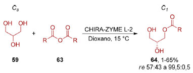 ![]() Esquema 16. Dessimetrização enzimática enantiosseletiva do glicerol (59) via acilação