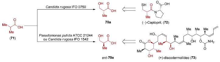 Os ácidos (R)- e (S)-β-hidroxi isobutíricos (70 e ent-70) são compostos muito utilizados como materiais de partida na síntese de produtos naturais e fármacos, sendo que suas preparações a partir da dessimetrização enzimática do ácido isobutírico (71) foram adaptadas à escala industrial (Esquema 18).