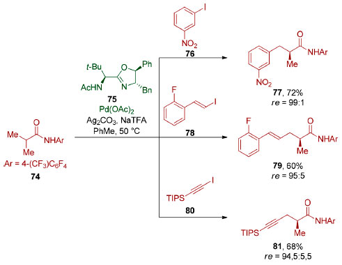 ![]() Esquema 19. Dessimetrização organometálica de um derivado do ácido isobutírico (71), por Yu e colaboradores107