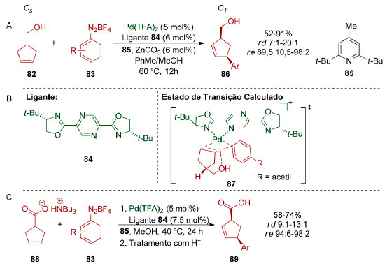 Em 2018, Correia e colaboradores relataram uma dessimetrização enantiosseletiva do álcool proquiral 82 através de uma reação de Heck−Matsuda (Esquema 20A).108 O produto 86 foi obtido como o diastereoisômero cis (rd=7:1-20:1), em excelente enantiosseletividade (re=89,5:10,5-98:2). Cálculos DFT (M06/6-31+G(d,p),SDD(Pd)) sugerem que a diastereosseletividade cis observada resulta de uma interação não-covalente entre a hidroxila do substrato e o centro metálico do catalisador de paládio catiônico (Esquema 20B).