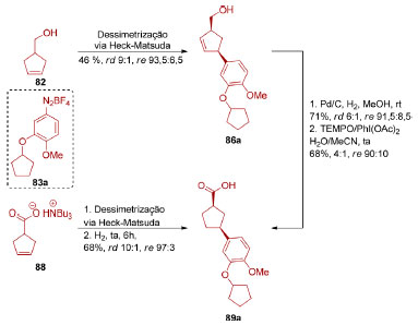O grupo de Correia também demonstrou que a interação eletrostática de carboxilatos com complexos catiônicos de paládio torna esses grupos diretores viáveis para dessimetrização via reação de Heck-Matsuda (Esquema 20C). O diastereoisômero cis (re = 9:1-13:1) também foi majoritário e alta enantiosseletividade (re=94:6-98:2) foi observada. A aplicabilidade e complementaridade das duas transformações foi demonstrada na síntese do inibidor de fosfodiesterase 4 89a (Esquema 21). O inibidor foi obtido através de uma hidrogenação da dupla ligação de 86a, seguida por oxidação do álcool primário ao ácido carboxílico, sendo, no entanto, observada uma erosão da estereosseletividade a cada etapa. Essa limitação pôde ser contornada empregando-se o carboxilato 88 como substrato na dessimetrização via reação de Heck-Matsuda.